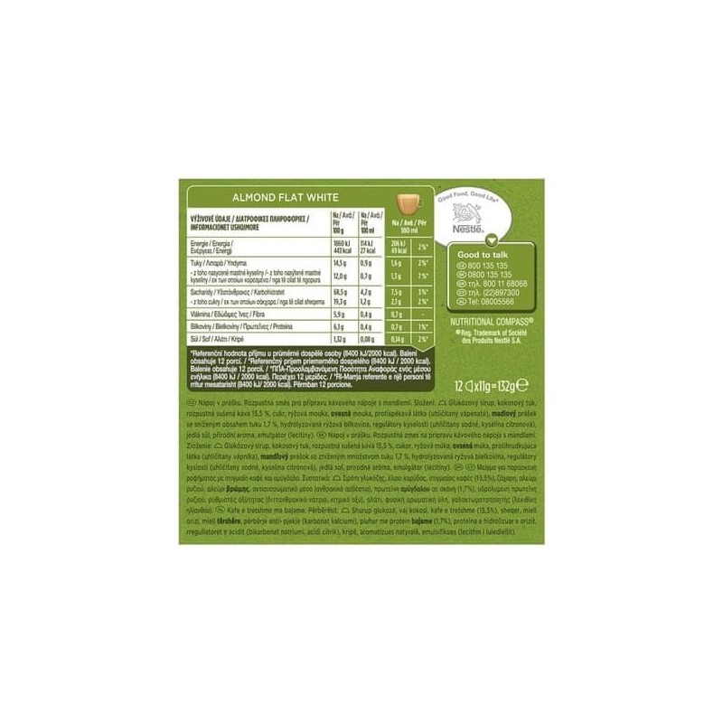 Összetétel: Glükózszirup, kókuszzsír, 15,5% oldható szárított kávé, cukor, rizsliszt, zabliszt, csomósodást gátló anyag (kalcium-karbonátok), 1,7% mandulapor csökkentett zsírtartalommal, hidrolizált rizsfehérje, savanyúságot szabályozó anyagok (nátrium-karbonátok, citromsav), asztali só, természetes aroma, emulgeálószer (lecitinek).