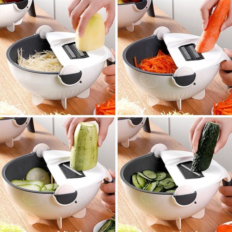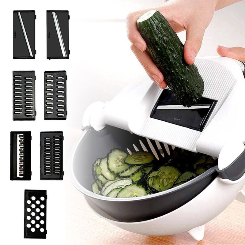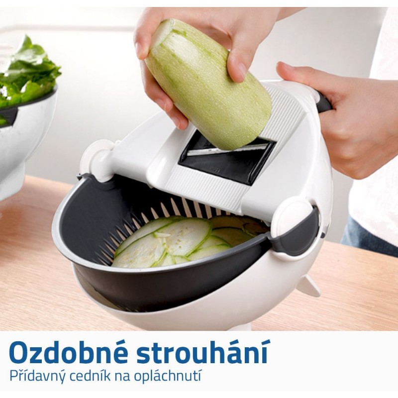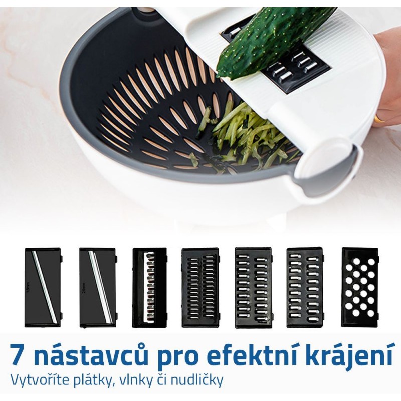 Praktikus multifunkciós szeletelő, amely használatába biztosan beleszeret! Az élelmiszerek szeletelésére szolgáló tálon felül 7 különböző, egyszerűen cserélhető pengét is talál, amelyek segítenek teljes mértékig optimalizálni a szeletelést. A szett és ujjvédőt zöldségpucolót is tartalmaz. A fogantyú kényelmes, nem csúszik. A szeletelő méretei 26 x 22 x 11 cm. A szett nem alkalmas mosogatógépbe.